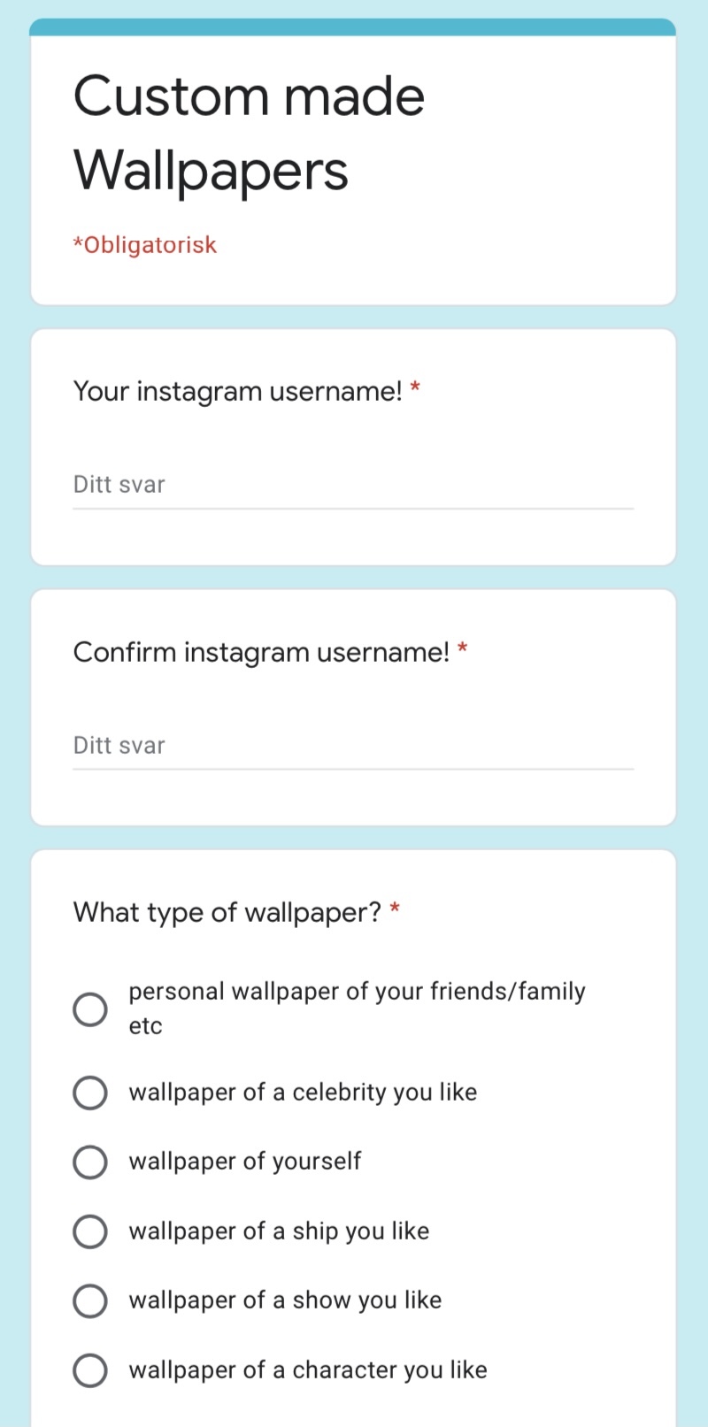 - Please make sure on the Google form that you correctly put your Instagram username as that will be my only way of contacting you and will be how I send the finished edit (If you type your username incorrectly and are then unable to receive the finished wallpaper I will NOT refund you as I spent time making the wallpaper so make sure to write it correctly)!